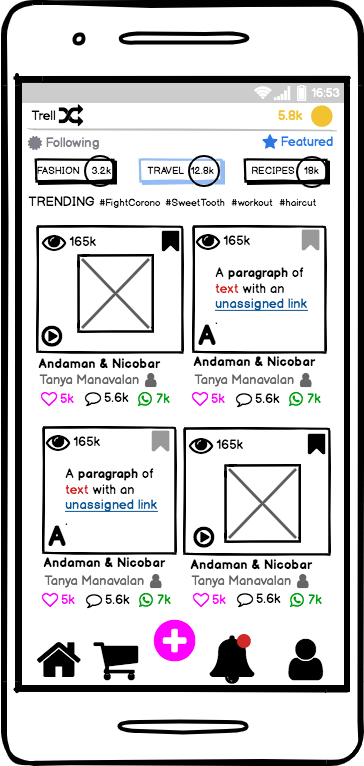 For the points discussed above, here’s the wireframe of the Home screen of the Trell app.